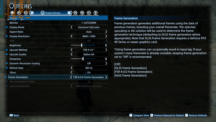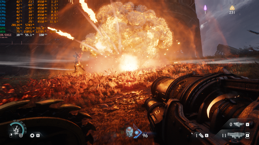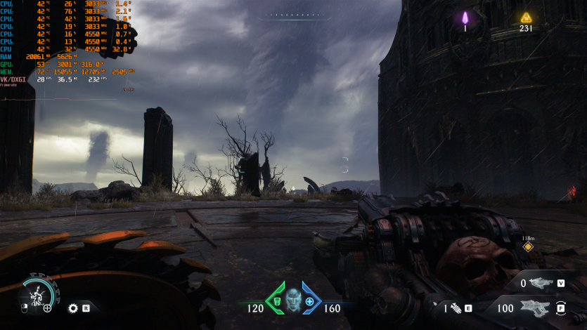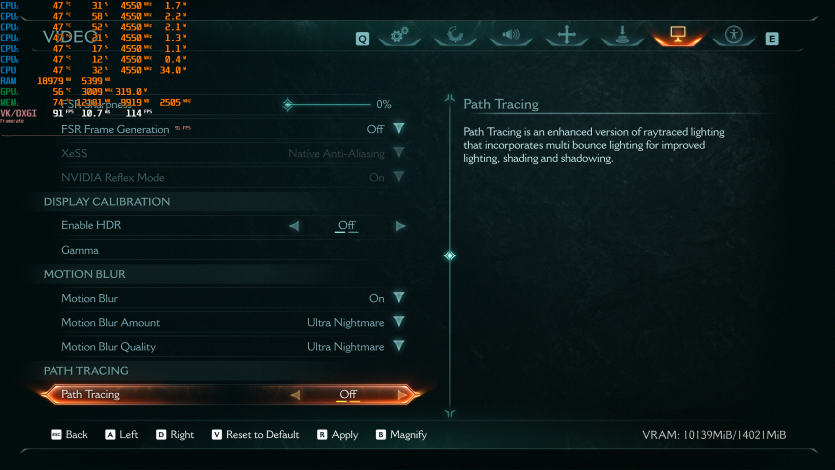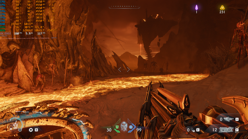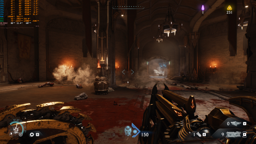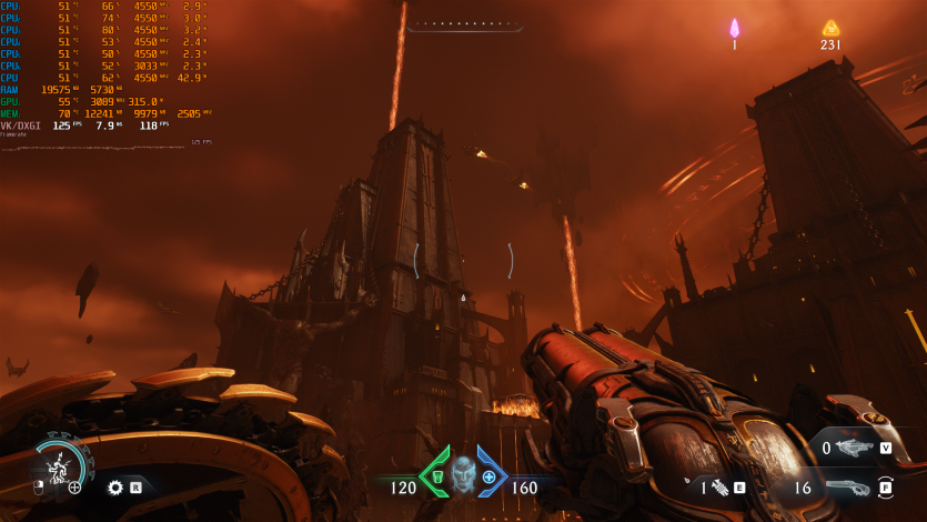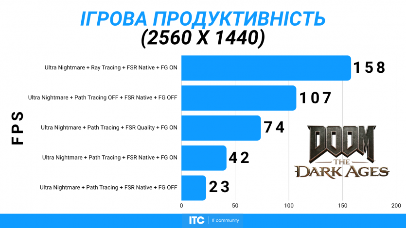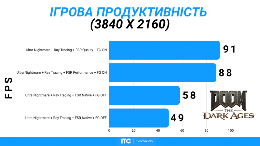 Doom: The Dark Ages с Ultra Nightmare, FSR Quality и FG (без Path tracing, но с «классическими» уже лучами) показывает ~91 FPS. Для такого ураганного экшена это уже ближе к минимально комфортному уровню.