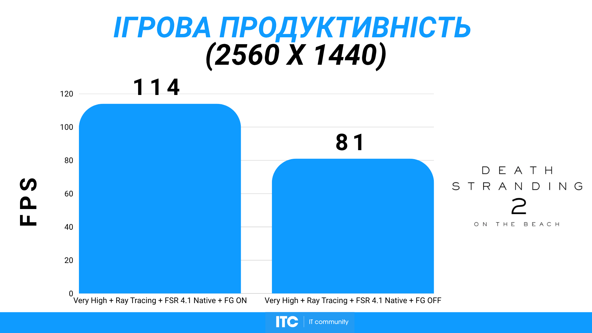 Death Stranding 2: On the Beach на Very High, с Ray tracing и FSR 4.1 Native + FG работает на уровне ~114 FPS. Тут уже четко видно влияние RT на нагрузку: FPS падает, но остается в комфортном диапазоне.