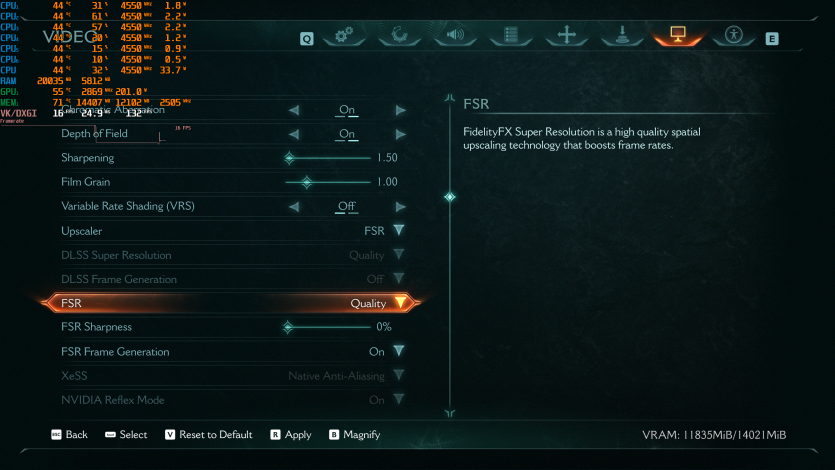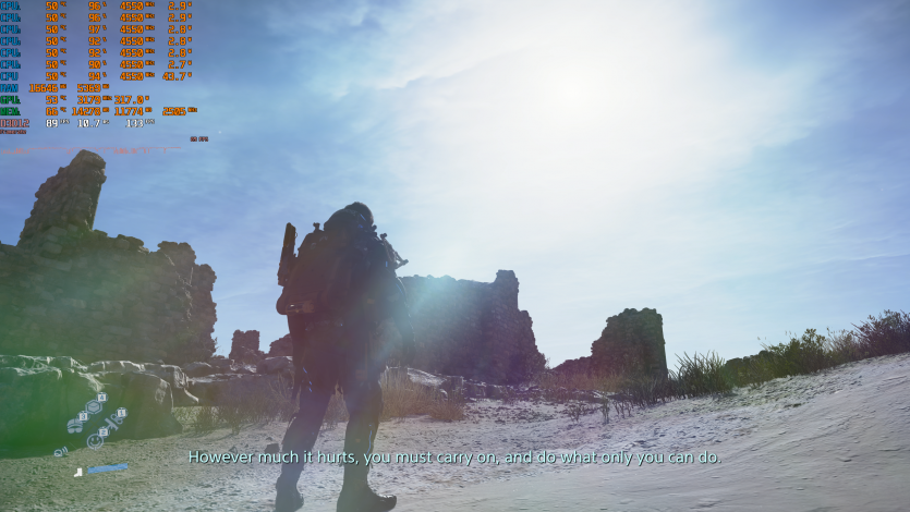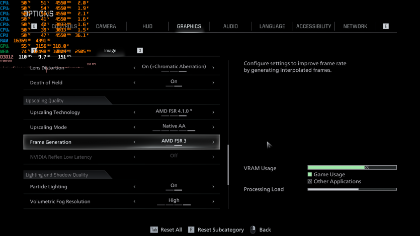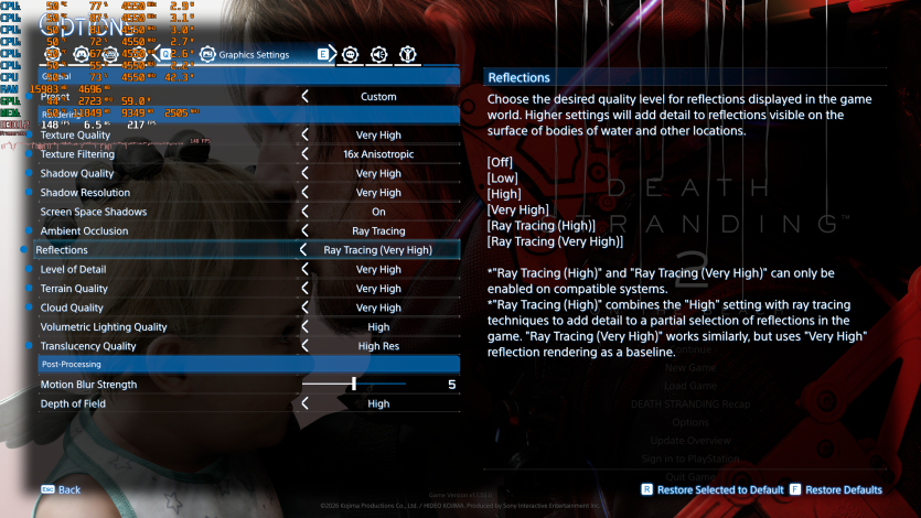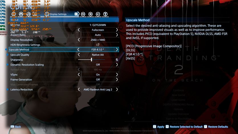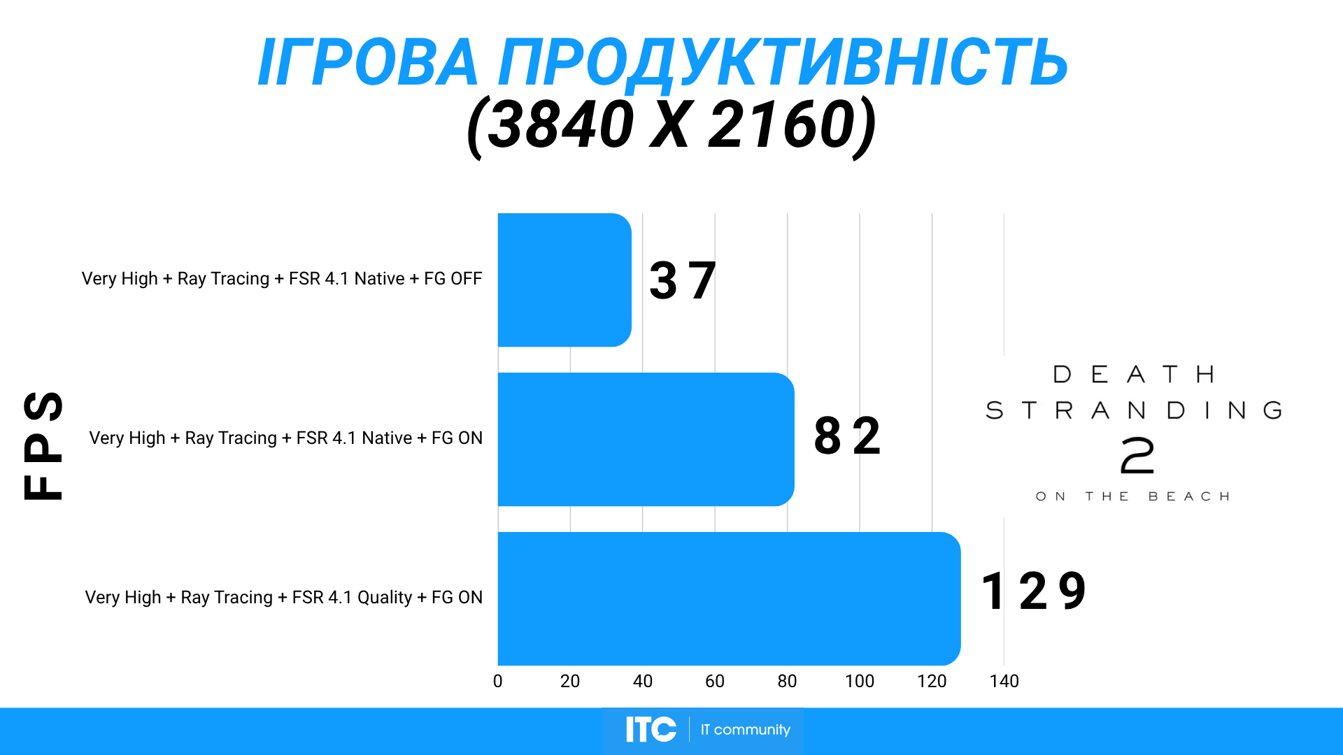 Еще один пример «absolute cinema-игры» — Death Stranding 2: On the Beach с Very High, RT и FSR 4.1 Quality + FG показывает ~128 FPS. Все еще комфортно и стабильно.