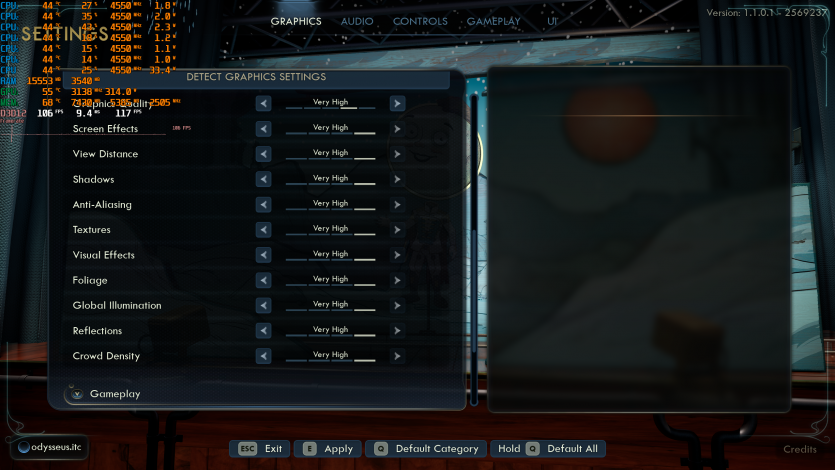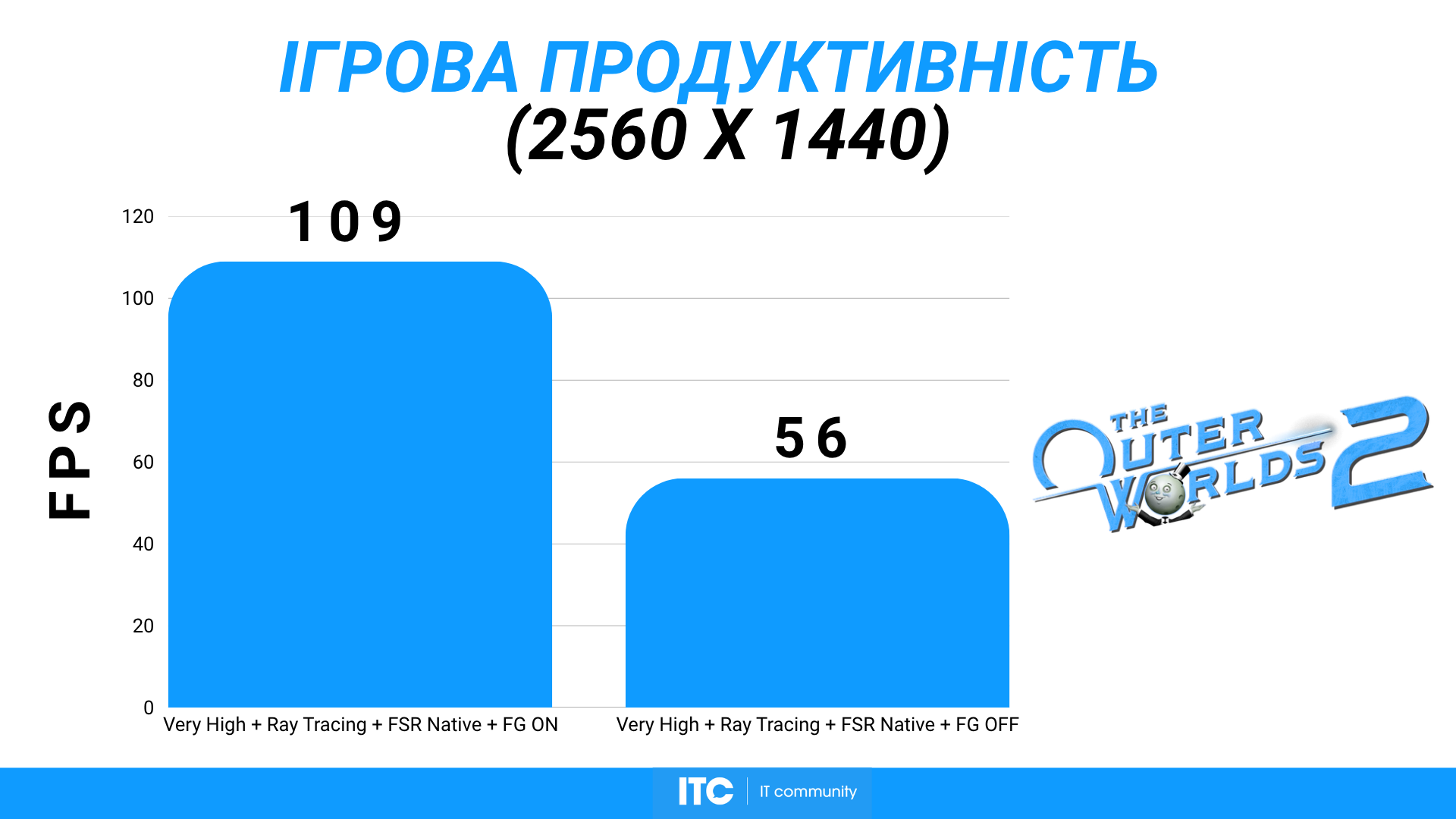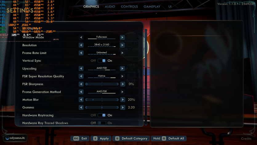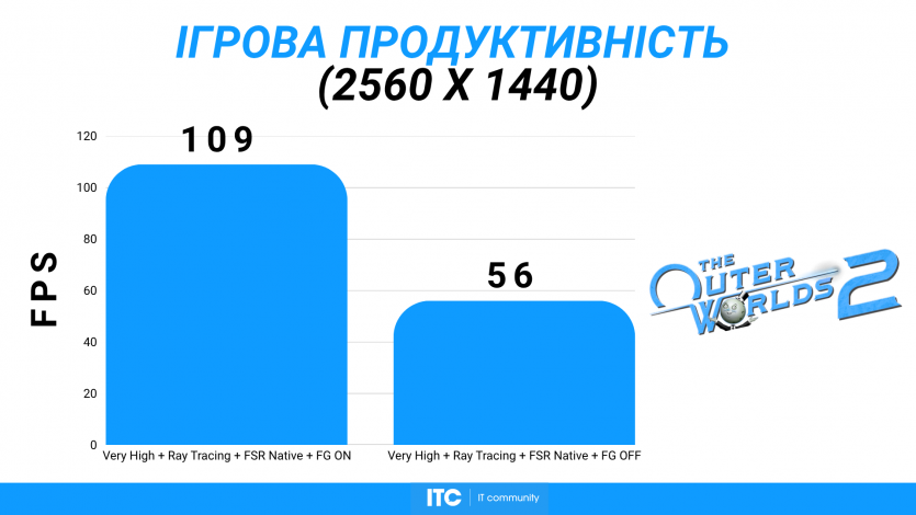 The Outer Worlds 2 на Very High, с «лучами» в FSR Native + FG дает ~109 FPS. Поведение очень похоже на Crimson Desert: стабильно, без резких провалов, но с четким пониманием, что Radeon RX 9070 XT Hellhound Reva Edition работает близко к своему максимуму.