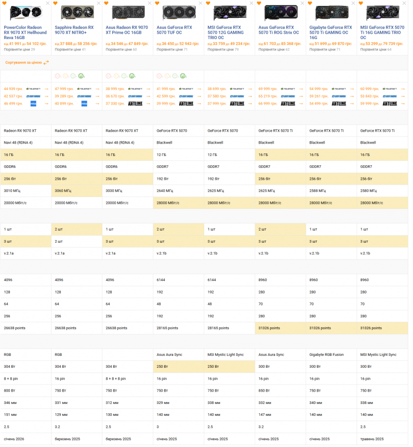 RTX 5070 Ti — в «честной» производительности впереди героиня обзора, но стоит включить RT, и NVIDIA перехватывает инициативу за счет апскейлеров. Цена «кусается»: 55-70+ тыс. грн, а топовые версии легко переваливают за 80. И вот тут RX 9070 XT начинает выглядеть как более рациональный выбор, если трассировка лучей не является приоритетом.