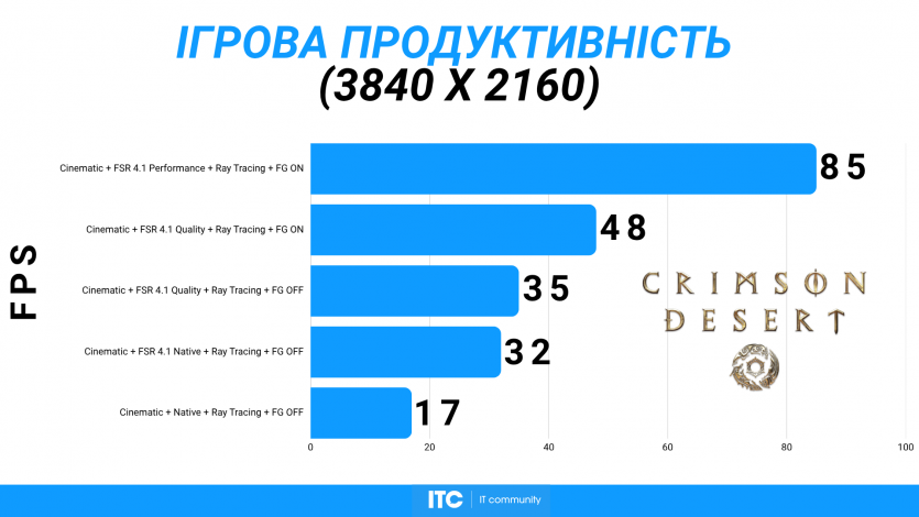 Crimson Desert на Cinematic-пресете выдает ~85 FPS. И это, пожалуй, лучше всего показывает, насколько тяжелой является сама игра. И оптимизировать ее Pearl Abyss можно было куда лучше.