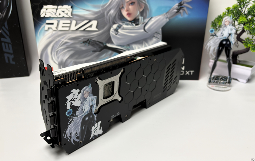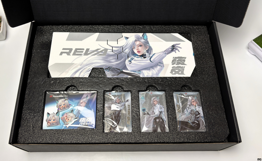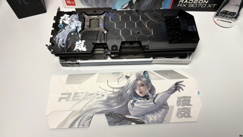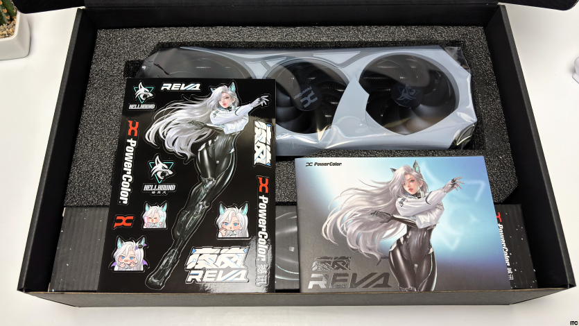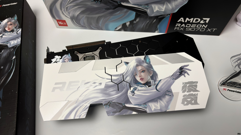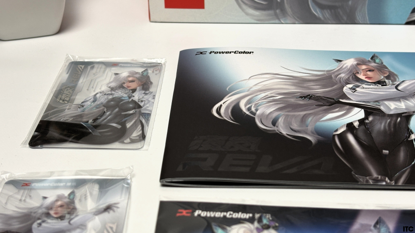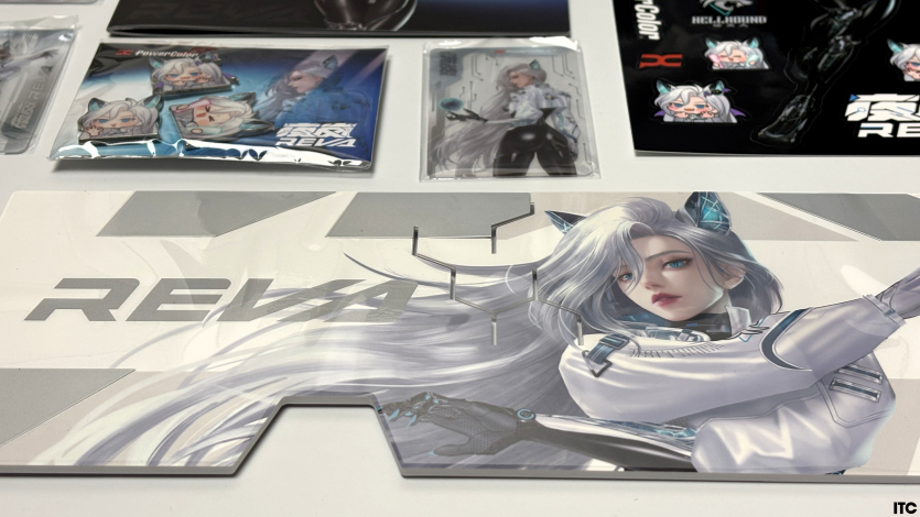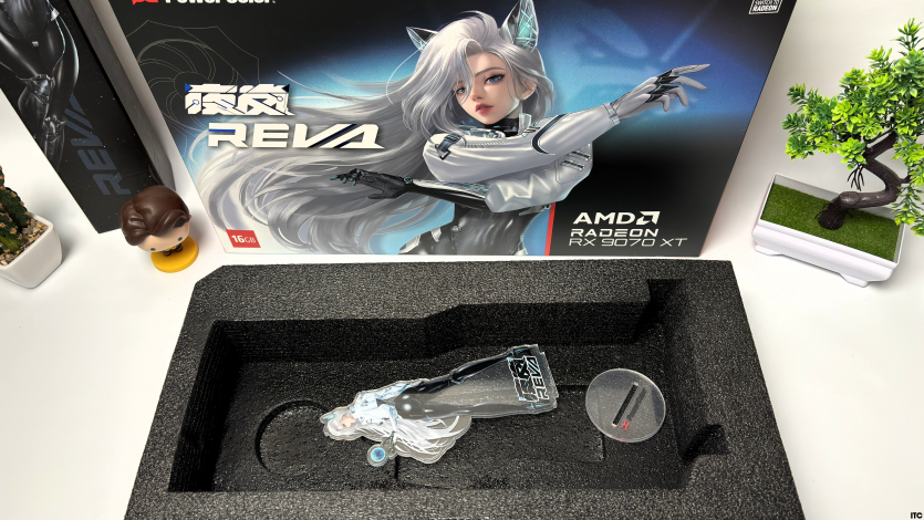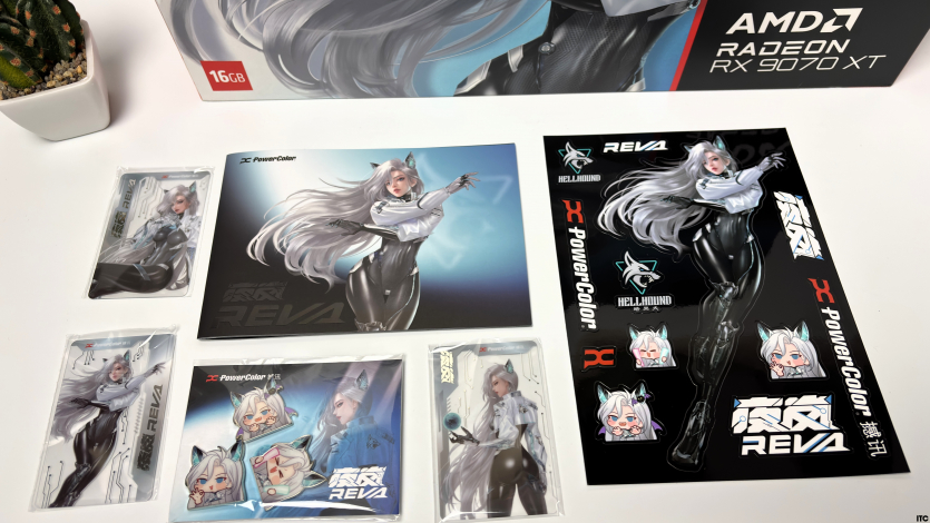 В комплекте Radeon RX 9070 XT Hellhound Reva Edition: акриловая фигурка Reva, набор стикеров, тематические бейджи (пины), коллекционные карточки с персонажем, небольшой буклет с лором, а также полноценная игровая поверхность с качественным принтом. Отдельно стоит упомянуть съемный бэкплейт, который позволяет немного изменить вид карты под белоснежную сборку.