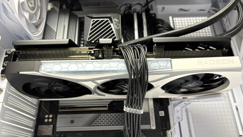 Установка Radeon RX 9070 XT Hellhound Reva Edition проходит без сюрпризов. Два 8-pin кабеля подключаются без проблем, карта не требует новых стандартов или переходников. Это мелочь, но после историй с 12VHPWR воспринимается как плюс.