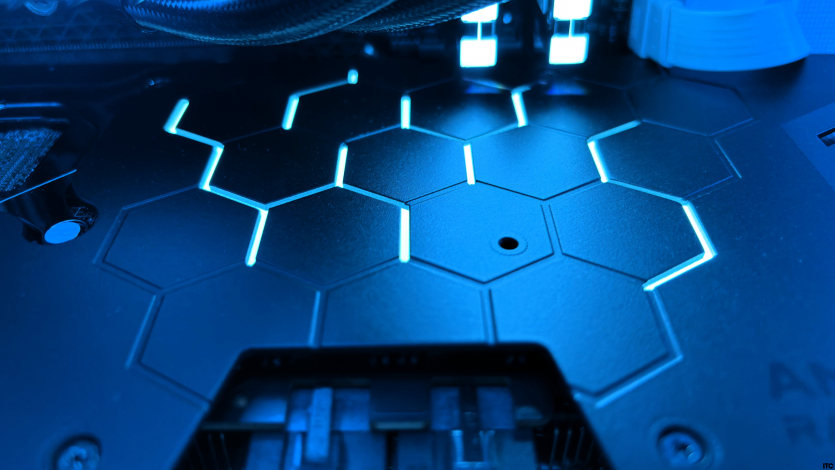 Подсветка здесь есть, но она не пытается доминировать. Тонкая световая полоса и несколько акцентов в виде пчелиных сот на бэкплейте выглядят сдержанно даже в темном корпусе. Важный нюанс, здесь есть физический переключатель для полного отключения RGB. Без софта, без танцев с бубном, один клик и все.