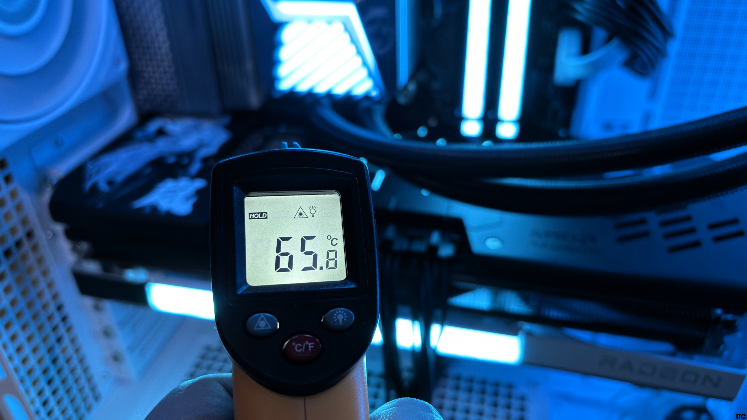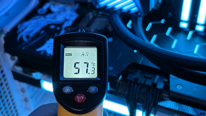 Если смотреть на реальное использование Radeon RX 9070 XT Hellhound Reva Edition, то картина еще более спокойная. В обычных играх температура по радиатору (по замерам пирометром) держится на уровне ~57 °C, а в синтетических тестах поднимается до ~65 °C. Это хорошо коррелирует с внутренними сенсорами и показывает, что система охлаждения эффективно отводит тепло наружу.