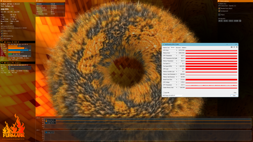 Под стресс-нагрузкой Radeon RX 9070 XT Hellhound Reva Edition ведет себя стабильно: потребление держится на уровне ~310-315 Вт без резких пиков или «провалов». GPU работает ровно, без намеков на троттлинг.