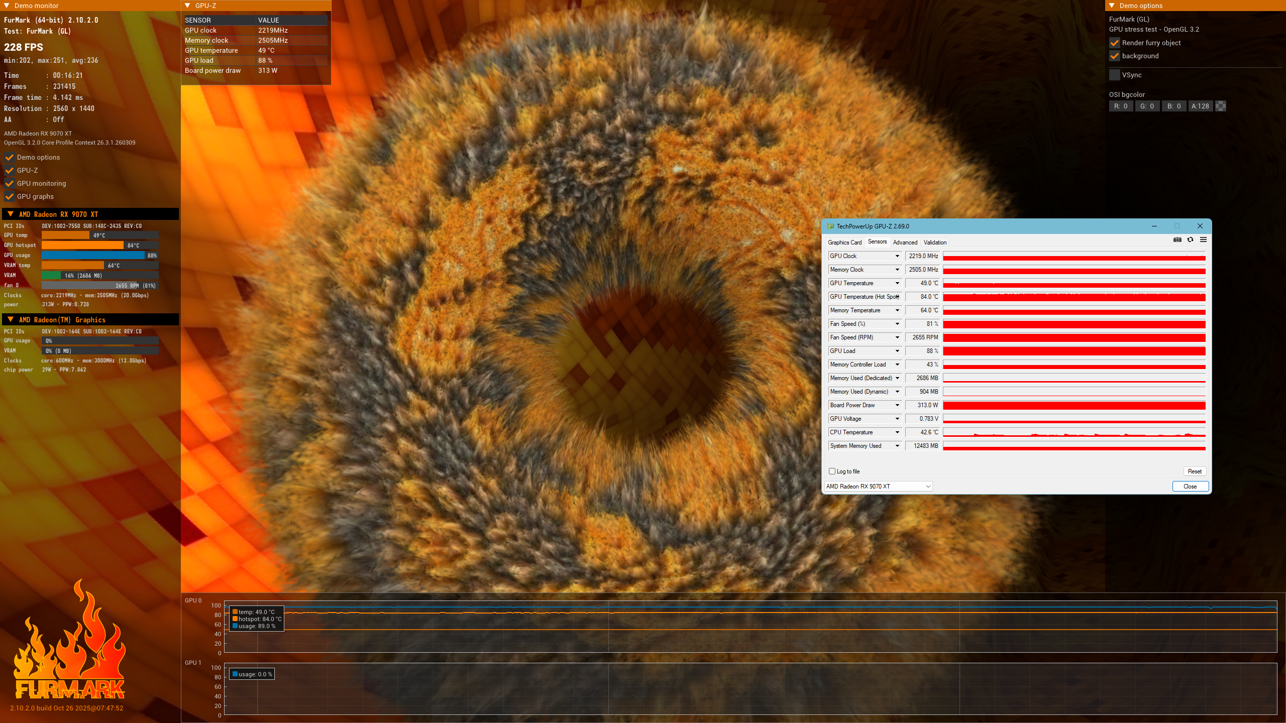 Температуры при этом выглядят интереснее. Сам GPU под нагрузкой держится около 49-50 °C, тогда как hotspot доходит до ~84 °C (в синтетике, в играх — минусуйте 3-4 градуса). Собственно, hotspot и показывает реальный «пиковый» нагрев отдельных участков, которые не всегда видно по среднему значению.