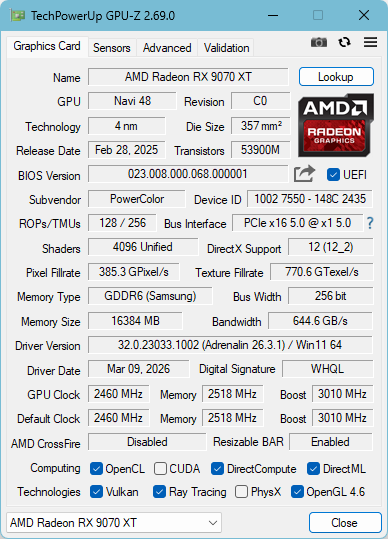 В основе Radeon RX 9070 XT Hellhound Reva Edition лежит чип Navi 48 XTX. Базовая частота в стандартном Quiet BIOS режиме достигает 2400 МГц в игровых сценариях, а пиковая Boost — 2970 МГц. В Game BIOS поднимается до 2460 МГц, в играх — до 3010 МГц.