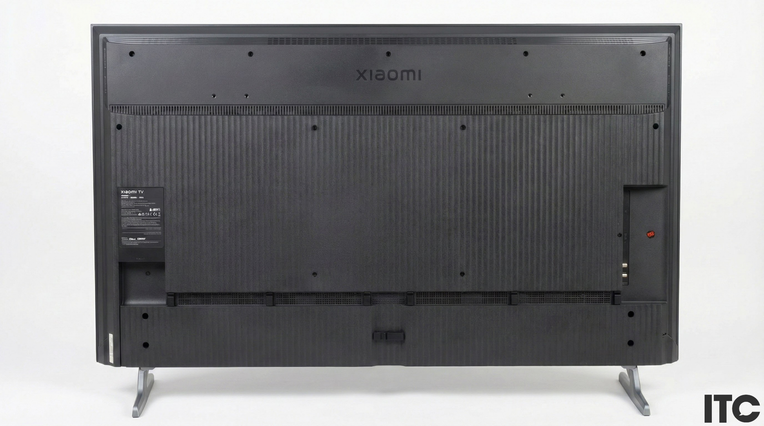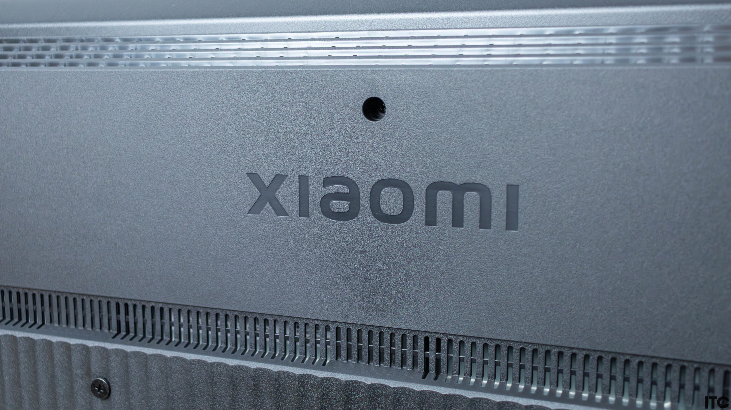 Задняя панель рифленая, серебряно-металлическая, но фактически она из матового пластика с текстурированным рисунком. По центру расположены крепления VESA 300×300 мм для настенного монтажа. Выше видим надпись Xiaomi.