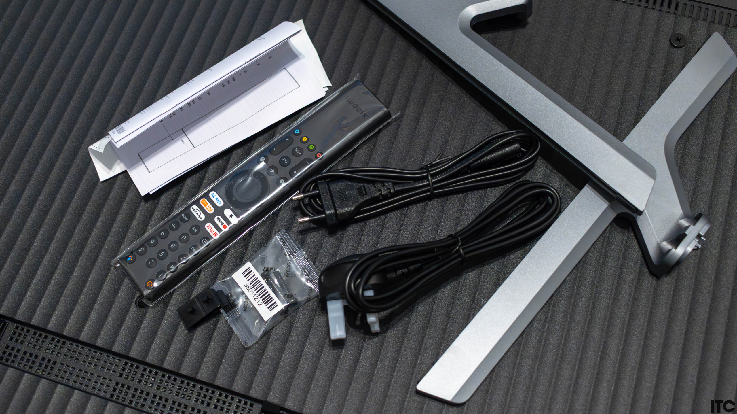 Внутри находится сам телевизор, обернутый защитной пленкой, пульт дистанционного управления (без батареек AA), два съемных кабеля питания (для нашего и европейского регионов), две, наверное, металлические ножки-подставки и винты к ним, а также документация.
