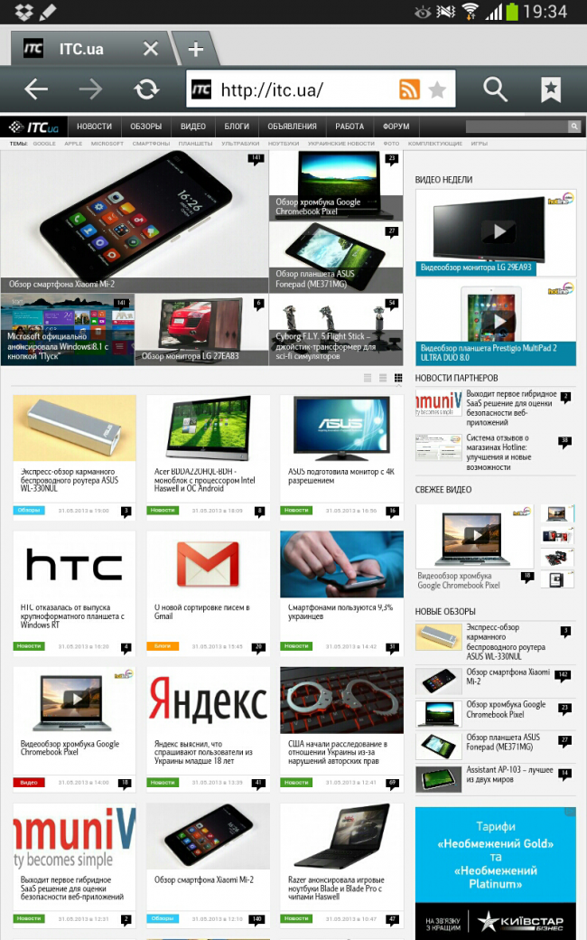 В официальных характеристиках производитель указывает, что в планшете используется 8-дюймовая TFT(PLS)-матрица с разрешением 1280 на 800 точек. Углы обзора достаточны для любой реальной ситуации использования и лишь на краях диапазона изменения угла обзора становится заметна характерная синева на темной части изображения. Яркости ожидаемо не хватает под ярким солнцем, однако в таких условиях выживают лишь единицы, так что проще перейти в тень, чем выкрутить подсветку на максимум и посадить батарею за считанные часы. Критиковать разрешение в 1280 на 800 точек особого смысла не имеет, так как экран с более высокой плотностью пикселей заметно увеличил бы стоимость планшета, к тому же любимому конкуренту компании Samsung никто не мешает успешно продавать модель с той же диагональю и еще меньшим разрешением.