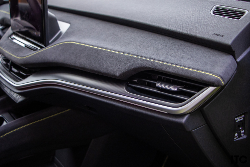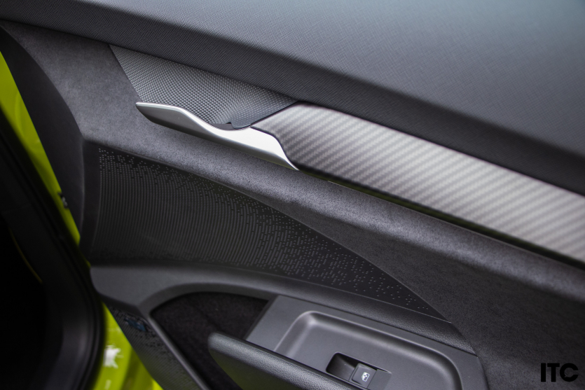 Салон RS отличается особым шиком от комбинации искусственной кожи и качественной микрофибры Suedia с лаймо-зеленой лентой. Дополняет особенность дизайна декор под карбон, спортивные ковши, руль с перфорированной кожей и шильдики RS.