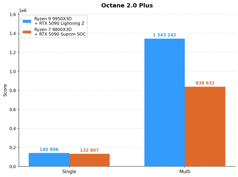 Рабочие бенчмарки демонстрируют ожидаемое преимущество старшего процессора в многопоточных сценариях. В CPU-Z multi-thread разница почти двукратная: 17 151 против 8 227 баллов, а в Cinebench R23 multi — 42 724 и 22 306 баллов соответственно. Octane 2.0 Plus в многопоточном режиме также логично отдает преимущество 32-поточному AMD Ryzen 9 9950X3D: 1 343 242 против 838 632 баллов.