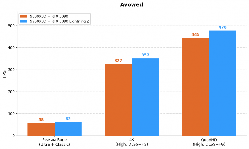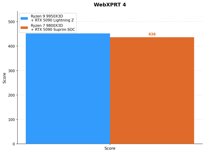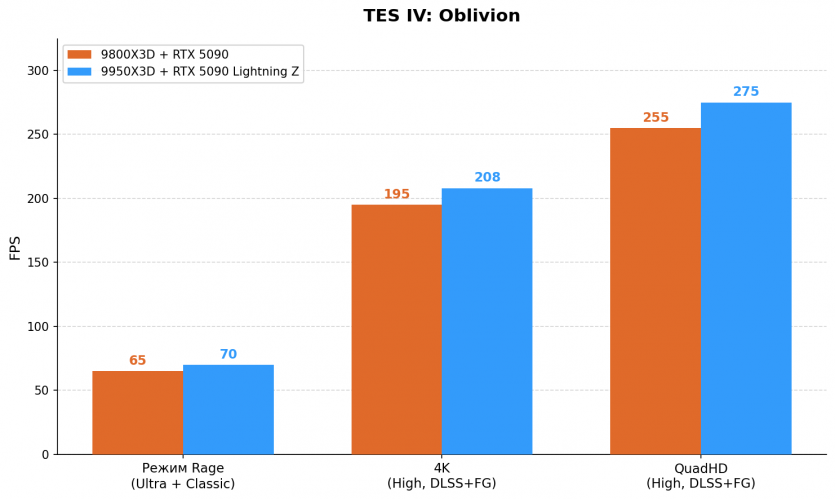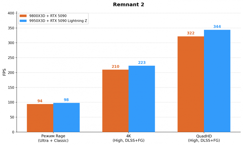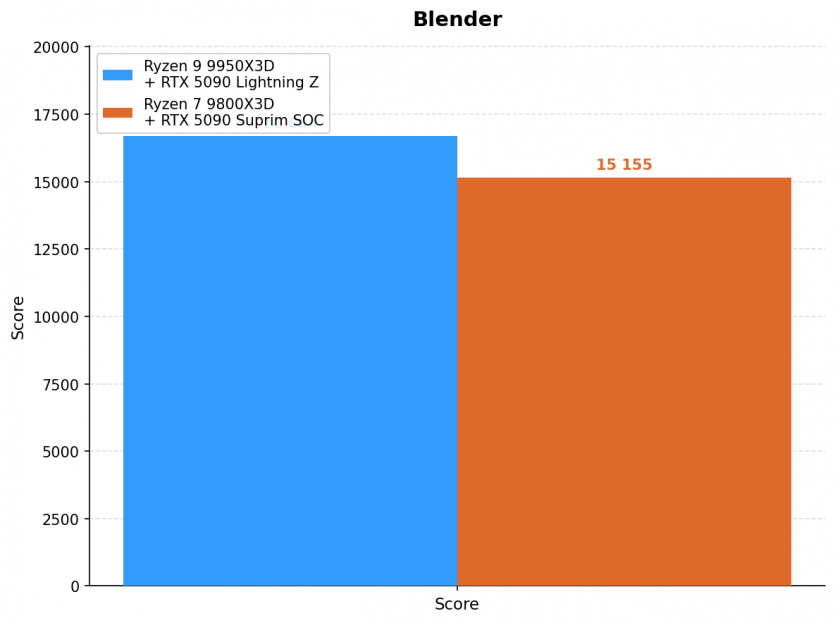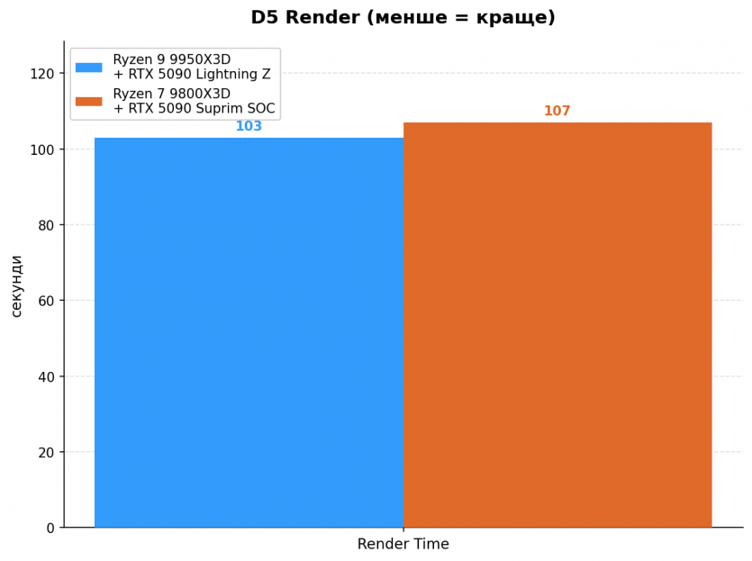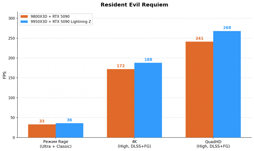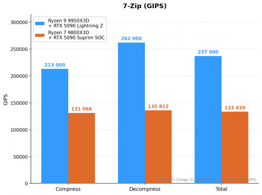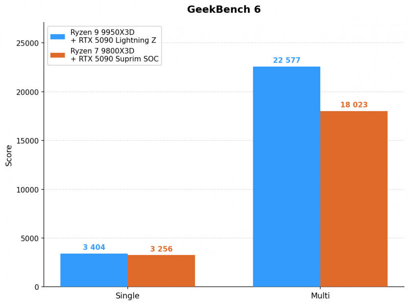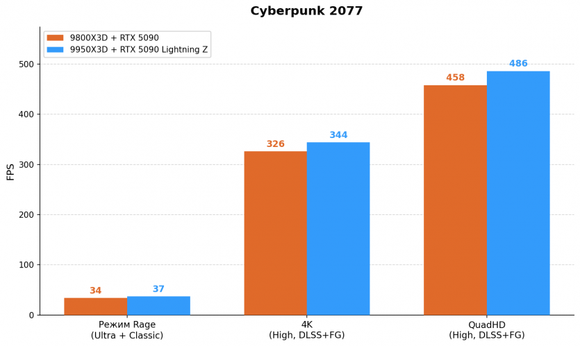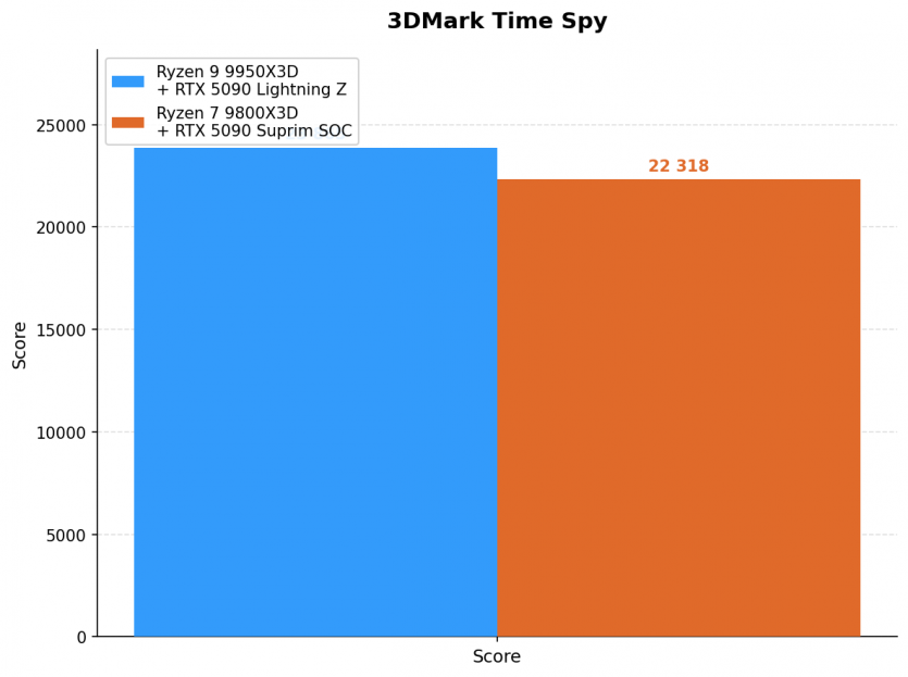 В играх разница между сборками колебалась в диапазоне 5-10%. И хотя RTX 5090 LIGHTNING Z с заводским разгоном и Ryzen 9 9950X3D последовательно опережают связку 9800X3D + RTX 5090 SUPRIM SOC, я все же лично для себя лучше бы выбрал 9800X3D.