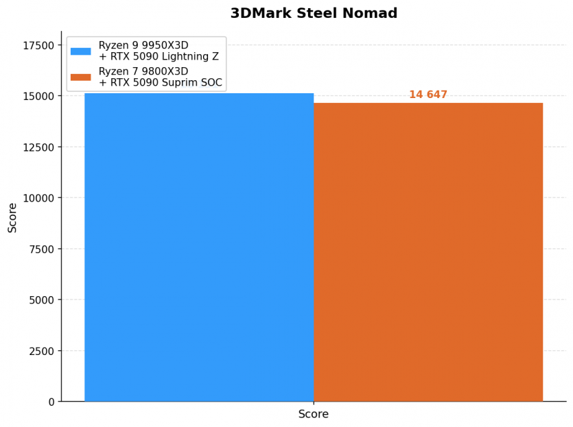В блендере MSI GeForce RTX 5090 LIGHTNING Z 32768MB Blender набрала 16 694 против 15 155 баллов с «обычной» MSI GeForce RTX 5090 32G SUPRIM SOC. 3DMark Time Spy также на стороне «молнии», как и Steel Nomad.
