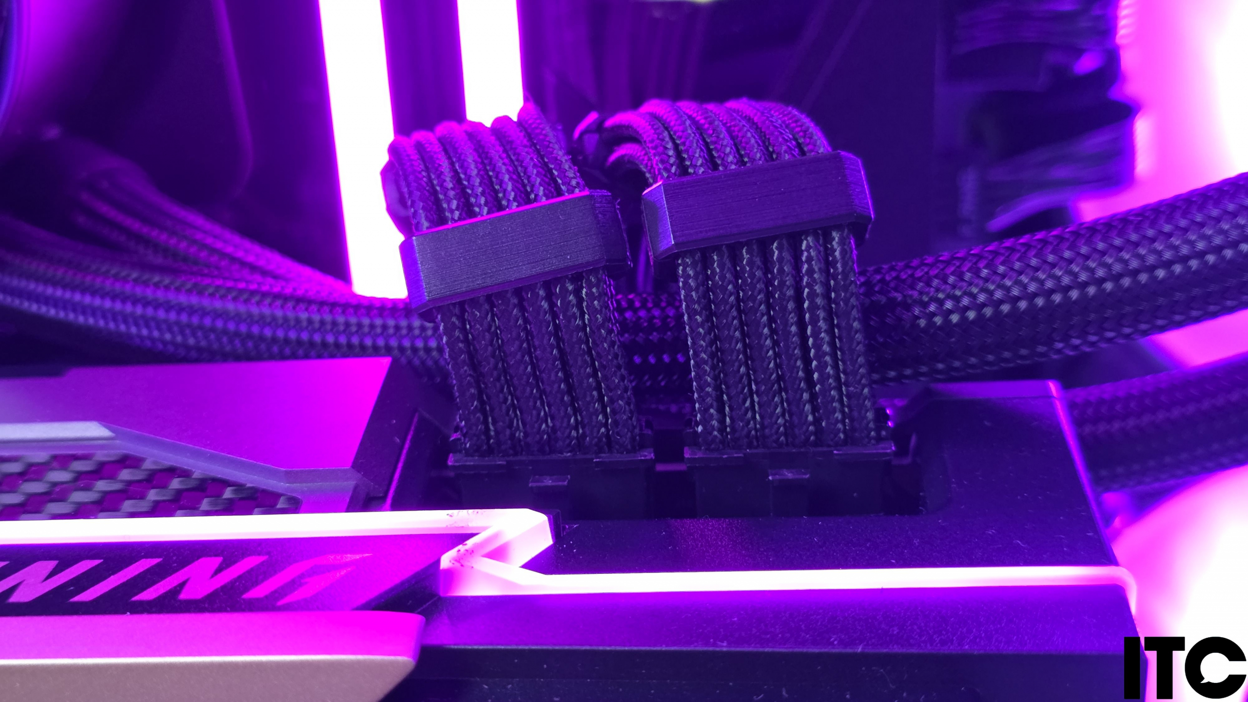 Отдельный 7-фазный VRM питает память. Питание подается через два 16-контактных разъема 12V-2×6, каждый из которых рассчитан на 600 Вт. В стандартном режиме (OC BIOS) лимит мощности составляет 800 Вт, переключатель на корпусе активирует Extreme BIOS с лимитом 1000 Вт.