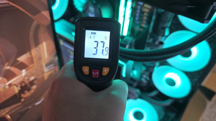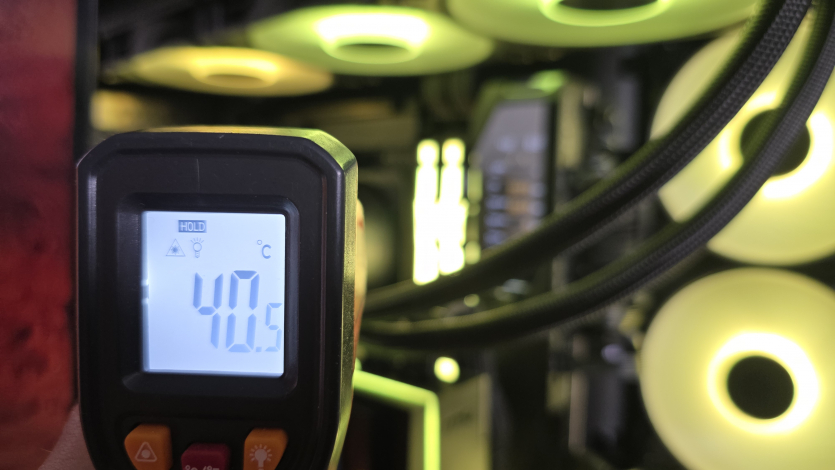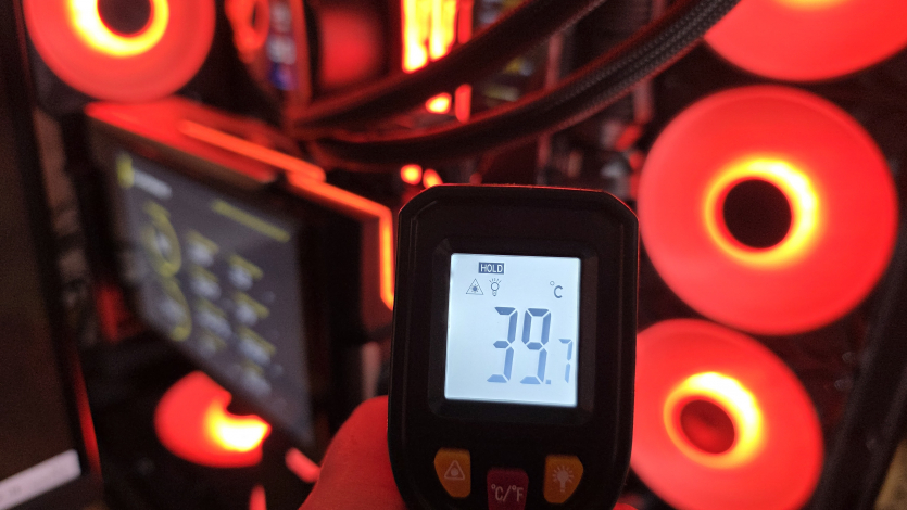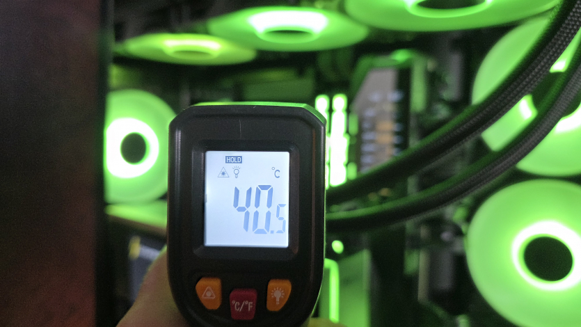 Тепло отводится на 360-мм радиатор с тремя высокопроизводительными вентиляторами, которые питаются и управляются непосредственно от видеокарты без дополнительных кабелей. Помпа работает постоянно, даже когда вентиляторы остановлены в режиме Fan Stop, поскольку при резком скачке нагрузки до 1000 Вт задержка на запуск мотора могла бы привести к перегреву