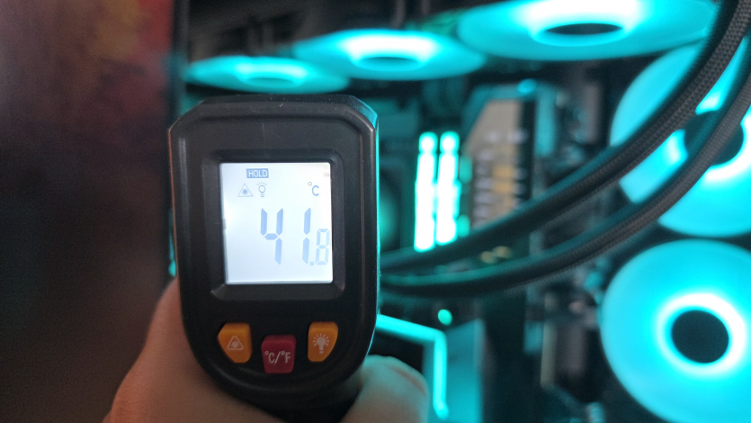 Температура VRM материнской платы не превышала 45 °C даже при одновременной загрузке CPU и GPU. Поэтому, имея 1600-ваттный блок питания, можно рассчитывать на солидный запас для разгона.