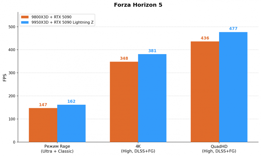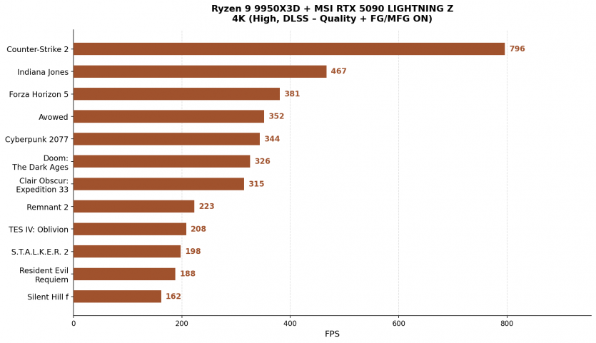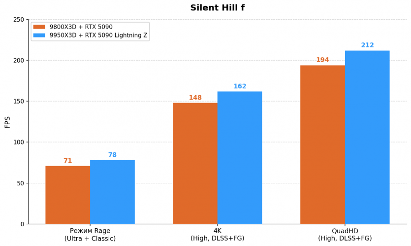 В S.T.A.L.K.E.R. 2 при 4K с DLSS преимущество составило около 5%. Clair Obscur: Expedition 33 показал больший разрыв — около 8%. Forza Horizon 5 продемонстрировала десятипроцентную разницу. Почти так же, как и Silent Hill f со своими 9,5%: 162 против 148 FPS в 3840х2160.