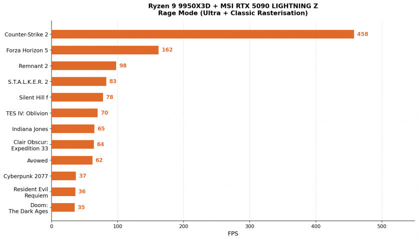 Doom: The Dark Ages известный своей ультимативной требовательностью к железу, работал на 35 FPS в чистой растеризации. Пока что никакая видеокарта современности не способна покорить максимальный пресет Ultranightmare с трассировкой пути без помощи апскейлеров.
