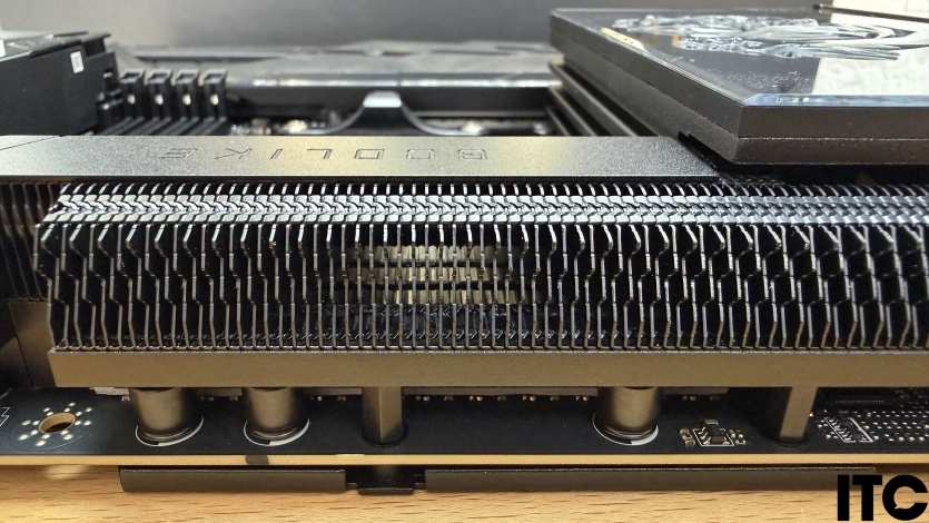 В MSI MEG X870E GODLIKE X EDITION кабельные соединения выполнены в боковом формате, поэтому они не скрыты от глаз и заметны со всех сторон панорамного стекла. Хотя даже при большом количестве подключений сборка сохраняет опрятный вид. К тому же кабели черного цвета обычно «растворяются» в неоне вентиляторов и трех дисплеев внутри ПК.