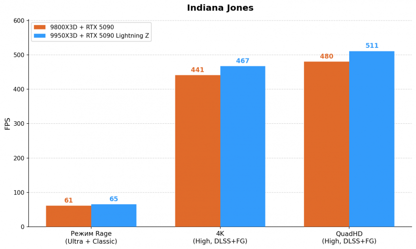 В S.T.A.L.K.E.R. 2 сборка выдала 83 FPS в режиме чистой растеризации, 198 FPS в 4K с DLSS + FG и 293 FPS в QuadHD. Indiana Jones and the Great Circle продемонстрировал 65, 467 и 511 FPS соответственно, чего более чем достаточно даже для самых требовательных настроек.