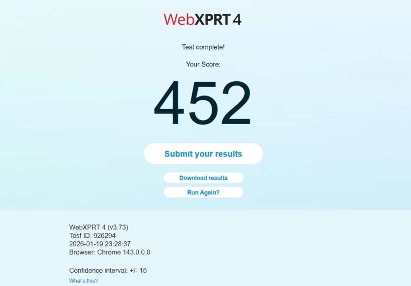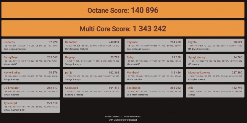 В CPU-Z процессор набрал 895 баллов в single-thread и 17 151 балл в многопоточном режиме. Браузерный Octane 2.0 Plus зафиксировал 140 896 и 1 343 242 балла соответственно. WebXPRT 4 показал 452 балла, а Speedometer остановился на 42.