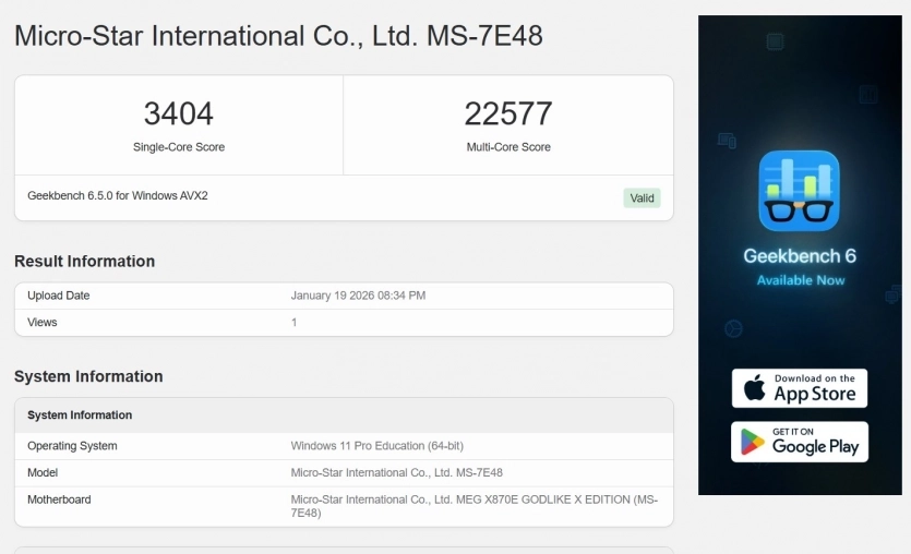 GeekBench 6 подтвердил высокую рабочую производительность: 3 404 балла в однопоточном и 22 577 баллов в многопоточном режиме. Тест памяти AIDA64 с профилем XMP продемонстрировал скорость чтения 76 264 МБ/с, записи 77 348 МБ/с и копирования 69 012 МБ/с при латентности около 79 наносекунд.