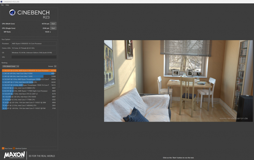 Cinebench R23 выдал 2 246 баллов в single и 42 724 балла в multi. В практическом рендеринге в программе D5 Render система справилась за 103 секунды, а Blender показал результат 16 694 балла. В 3DMark Steel Nomad зафиксировано 15 131 балл, а Time Spy достиг 23 865 баллов.