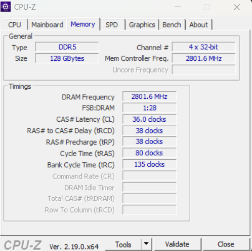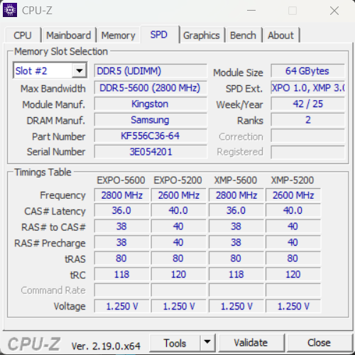 Четыре слота DIMM поддерживают до 256 ГБ DDR5 с максимальной частотой 9000 MT/s в режиме разгона, но в нашем случае стоит две планки Kingston FURY Beast RGB общим объемом 128 ГБ, работающие в двухканальном режиме на частоте 5600 МГц