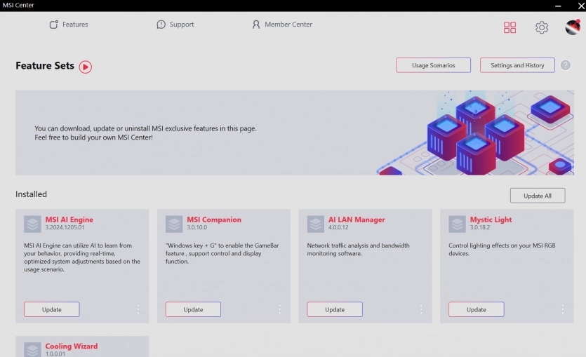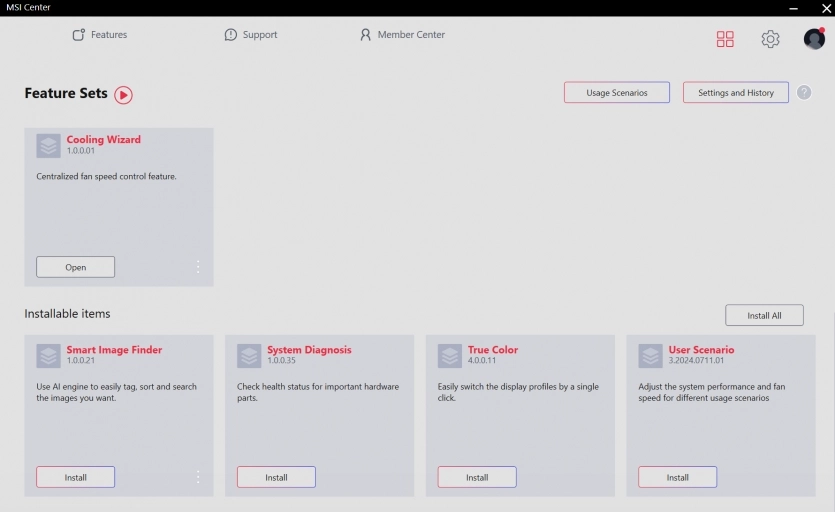 MSI Center объединяет мониторинг системных параметров, обновление драйверов, управление подсветкой и регулировку производительности в едином интерфейсе. Программа также предлагает автоматическую установку драйверов, что упрощает первоначальную настройку.