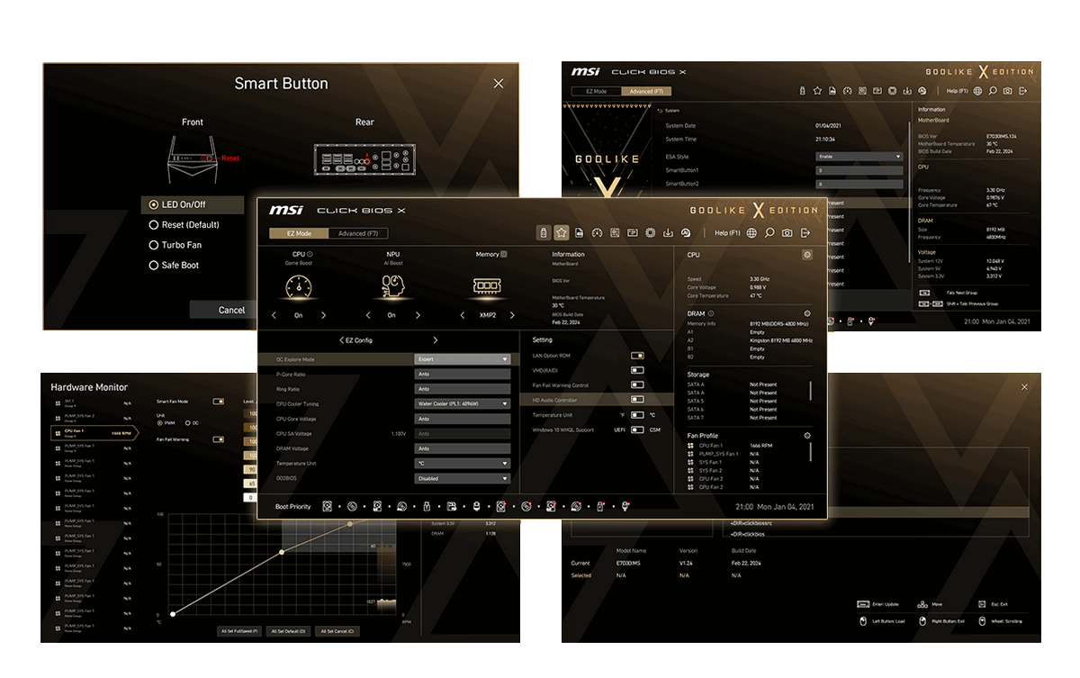 UEFI BIOS под названием CLICK BIOS X (емкостью 64 МБ) разделен на два режима. EZ Mode позволяет быстро изменить порядок загрузки, активировать профили AMD EXPO для автоматического разгона DDR5 или включить Precision Boost Overdrive. Advanced Mode открывает полный контроль над напряжением, частотами, таймингами памяти и профилями охлаждения.