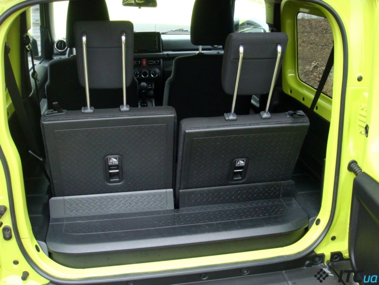 Автомобиль построен на рамной основе, спереди и сзади использованы сплошные мосты на пружинах, двигатель установлен продольно, передние колеса подключаются жестко (Part Time), предусмотрен понижающий ряд трансмиссии. Добавьте клиренс 21 см, короткие свесы (угол въезда – 37 градусов, угол съезда – 49 градусов, угол рампы – 28 градусов), да общую легкость автомобиля. Надо ли говорить, что на бездорожье Suzuki Jimny – это «царь горы»? Проверенно в Карпатах во время первой ездовой презентации модели. Ограничения на бездорожье лишь два. Во-первых, автомобиль узкий и высокий, на мягкой подвеске – нужно быть осторожным с поперечным креном, иначе и до переворота недалеко. Во-вторых, топливный бак Suzuki Jimny вмещает лишь 40 л, чего достаточно на полдня-день ползанья по бездорожью на «понижайке». Если планируете экспедицию в глухие места – то придется брать запас топлива в салон, а там и так места немного.