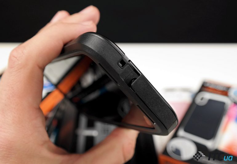 Чтобы уменьшить вес чехла, производитель сделал прорези не только на нижней грани, где находится динамик, микрофон и Lightning, но и на верхней. При этом нижняя и верхняя часть в Recon более мягкие, что позволяет проще вставлять и вынимать смартфон, а вот боковые грани довольно жёсткие, что обеспечивает чехлу дополнительную прочность.