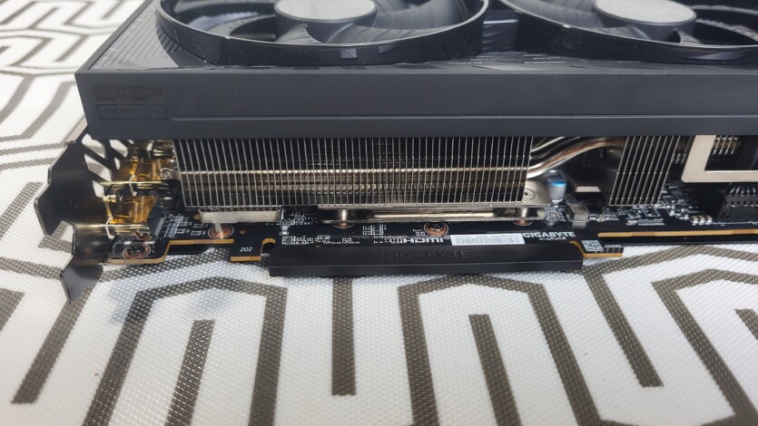 The fans are equipped with graphene nanolubricant, which Gigabyte claims reduces noise and increases durability compared to traditional bearings. A heat-conducting gel is located under the shroud, and a large evaporation chamber and copper heat pipes remove heat from the GPU The Dual BIOS feature allows you to switch between Performance and Silent modes, allowing you to choose between maximum performance and reduced noise.