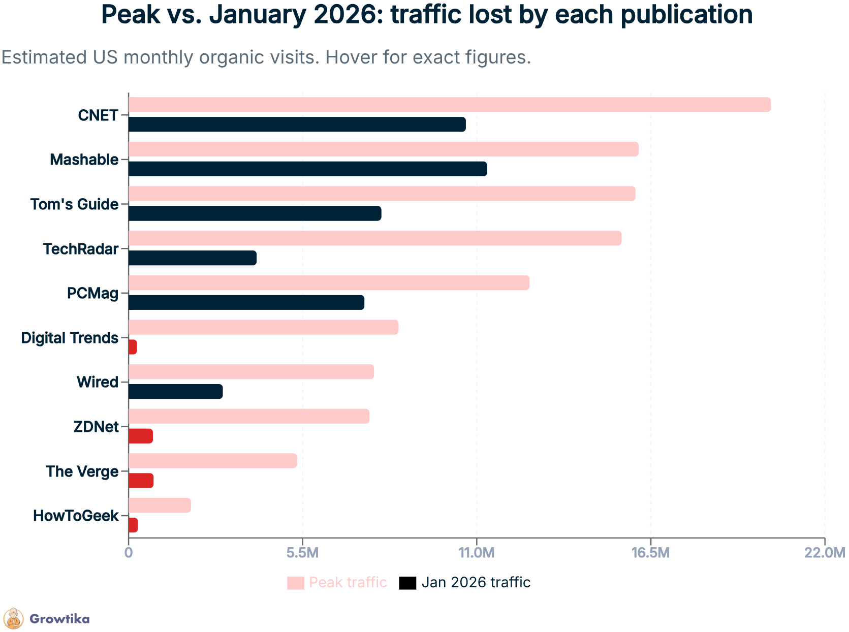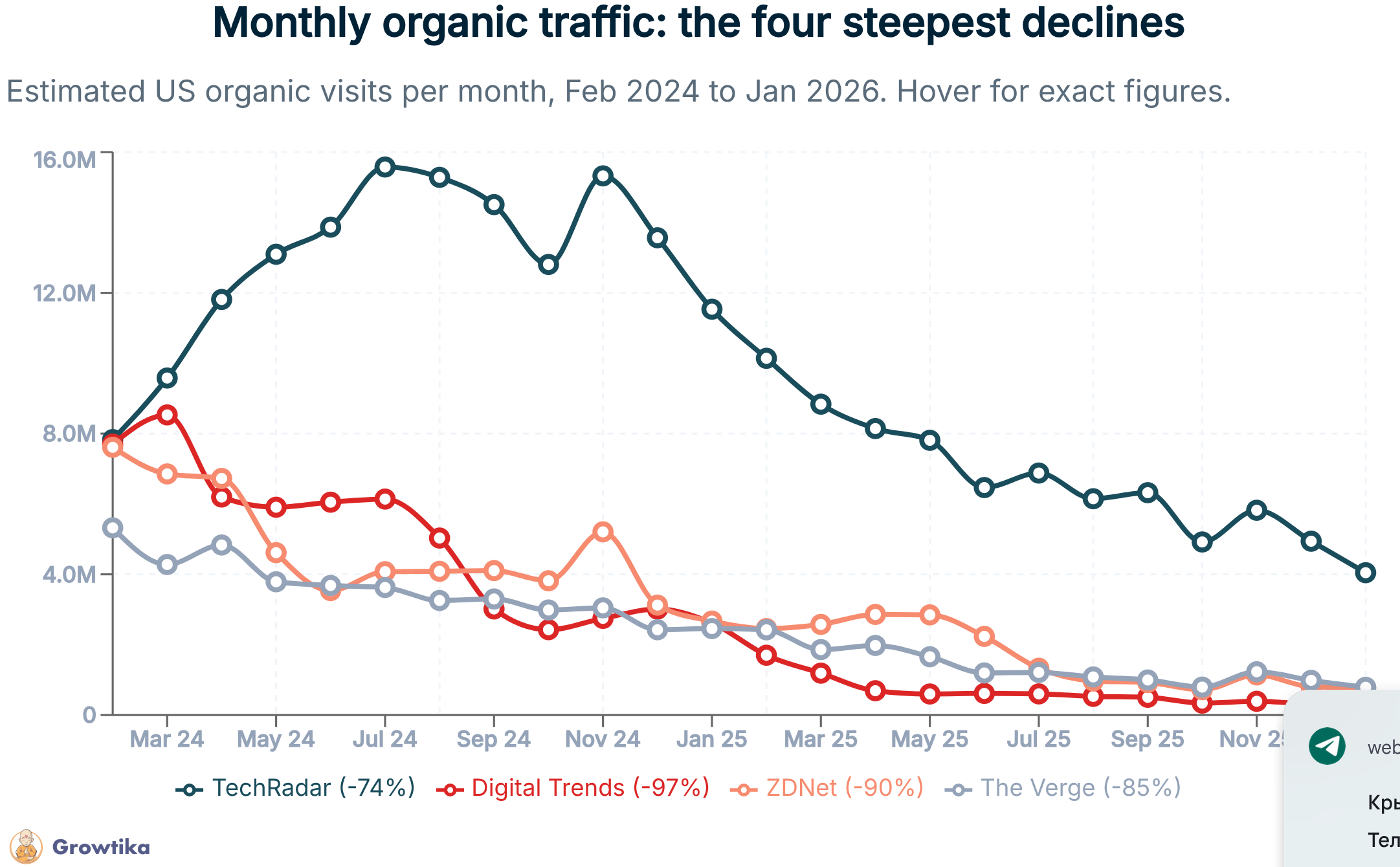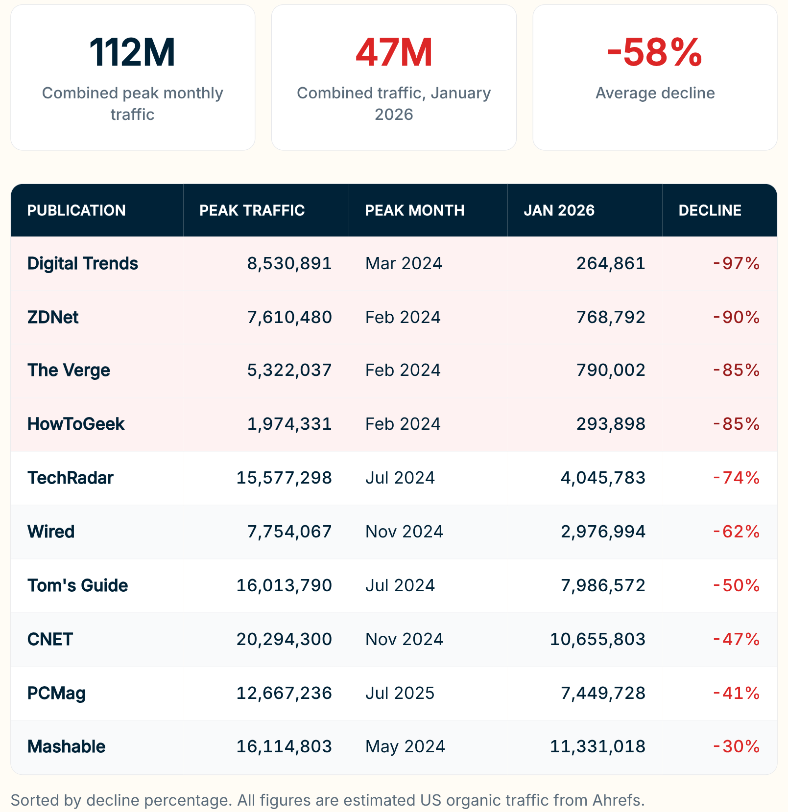 Лучший результат показал Mashable, который потерял «всего» 30% веб-трафика между пиковым показателем и январем 2026 года. Это много, но значительно меньше, чем у Wired, который потерял 62% трафика, или у группы изданий HowToGeek, The Verge и ZDNet, каждое из которых за два года потеряло более 85% посещаемости. Самая драматичная история — у техномедиа Digital Trends: от 8,5 млн кликов в месяц в марте 2024 года до 264 861 в январе 2026-го. Это колоссальное падение — минус 97% веб-трафика из Google в США.