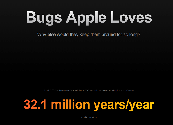 Главная страница с иронией встречает фразой «Почему Apple так долго это не делает?». Счетчик показывает, что якобы «32,1 млн лет пользовательского времени ежегодно тратится впустую». На сайте попытались не просто перечислять баги, а показать их масштаб в цифрах. Каждая проблема сопровождается не только подсчетами убытков клиентов, но и приблизительным временем исправления ошибки со стороны Apple. Однако они могут выглядеть преувеличенными и ниже будет объяснение почему.