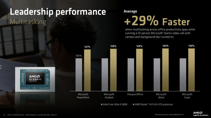 AMD опубликовала слайды со сравнением производительности Ryzen AI 9 HX 470 и Ryzen AI 9 HX 470 и Intel Core Ultra 9 288V. В создании контента AMD заявляет о +71% среднего FPS в обычных программах. Для игр заявлен средний перевес FPS +12% при низких настройках в разрешении 1080p.