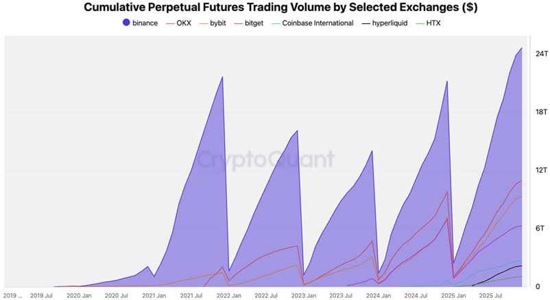 Об этом криптобиржа сообщила в отчете CryptoQuant во вторник. На втором месте по притокам в 2025 году находится Coinbase с показателем $946 млрд, что также означает рост на 30% в годовом измерении. Биржа движется к установлению новых исторических максимумов как по объемам спотовой торговли, так и по объемам торговли бессрочными фьючерсами, а также по уровню притока криптоактивов в долларовом выражении. Кроме того, Binance недавно превысила отметку в 300 млн зарегистрированных пользователей — это также рекорд в криптосекторе.
