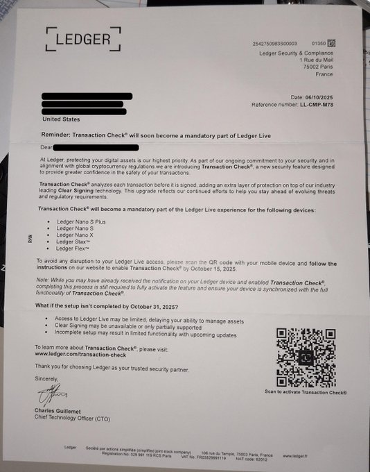 Подобное письмо на тему Ledger было опубликовано в X, утверждая, что «Проверка транзакций» вскоре станет обязательной, и предупреждая пользователей отсканировать QR-код для активации функции до 15 октября 2025 года, чтобы избежать перебоев.Сканирование QR-кодов ведет жертв на фишинговые сайты, что выдают себя за официальные страницы настройки Trezor и Ledger. На момент написания статьи фишинговый домен Ledger офлайн, тогда как фишинговый сайт Trezor до сих пор активен, но уже обозначен Cloudflare как фишинговый сайт.