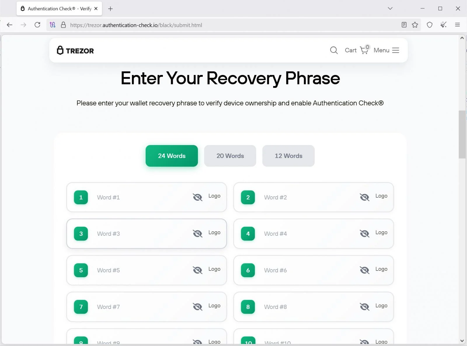 Эти предупреждения созданы для дополнительного ощущения срочности, чтобы жертвы продолжали до следующей части процесса настройки. Если жертвы продолжают, их перенаправляют на финальную фишинговую страницу, которая просит ввести фразу восстановления кошелька. Страница позволяет вводить 24-, 20- или 12-словные фразы восстановления и утверждает, что эта информация нужна для проверки собственности устройства и активации функции аутентификации. После ввода фраза восстановления передается злоумышленнику.