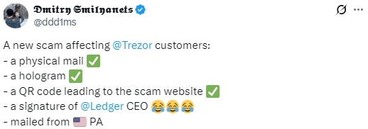 В последние дни усилились фишинг-атаки на владельцев криптокошельков. Злоумышленники присылают физические письма, где выдают себя за производителей аппаратных криптовалютных кошельков Trezor и Ledger, чтобы обманом заставить пользователей предоставлять фразы восстановления.