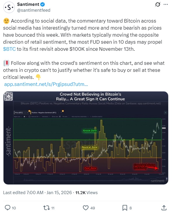 Аналитики Santiment обращают внимание и на информационный фон. Несмотря на обновление ценовых максимумов, настроения в соцсетях остаются преимущественно отрицательными. Уровень страха, неопределенности и сомнений достиг самых высоких значений за последние 10 дней. Исторически подобные периоды скепсиса нередко совпадали с последующим продолжением роста, поскольку значительная часть рынка не верит в стабильность движения.