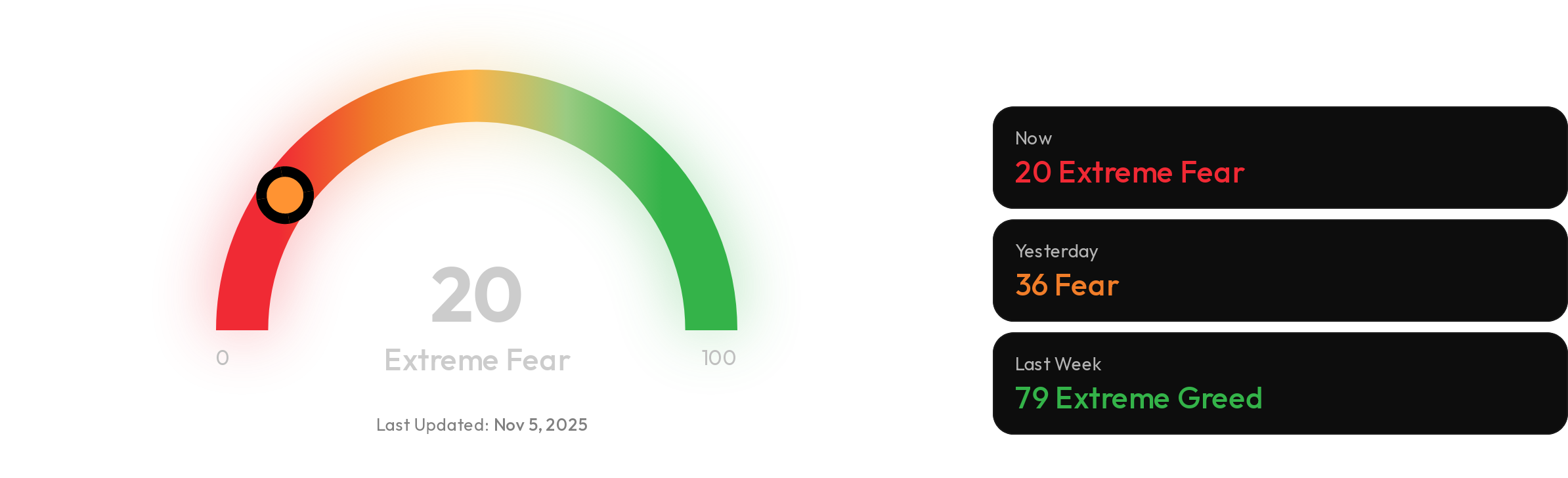 В ночь с 4 на 5 ноября биткоин впервые с июня 2025 года пересек психологический рубеж в $100 000: в моменте его цена составляла $98 945. Вслед за ним также просел Ethereum — до $3 057. Индекс страха и жадности упал до 20 — это свидетельствует об «экстремальном» страхе на рынке.