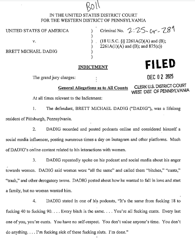 В обвинительном акте говорится, что Дадиг вел подкаст на Spotify и соцсети, где высказывал ненависть к женщинам и жаловался, что никто не хочет с ним отношений. Он заявлял, что женщины «все одинаковые», называл их унизительными бранными словами. После банов в нескольких заведениях он переходил в новые, а затем уехал в другие штаты. Дадиг использовал разные псевдонимы, менял данные, при этом угрожал «душить людей голыми руками» и называл себя «убийцей Бога».