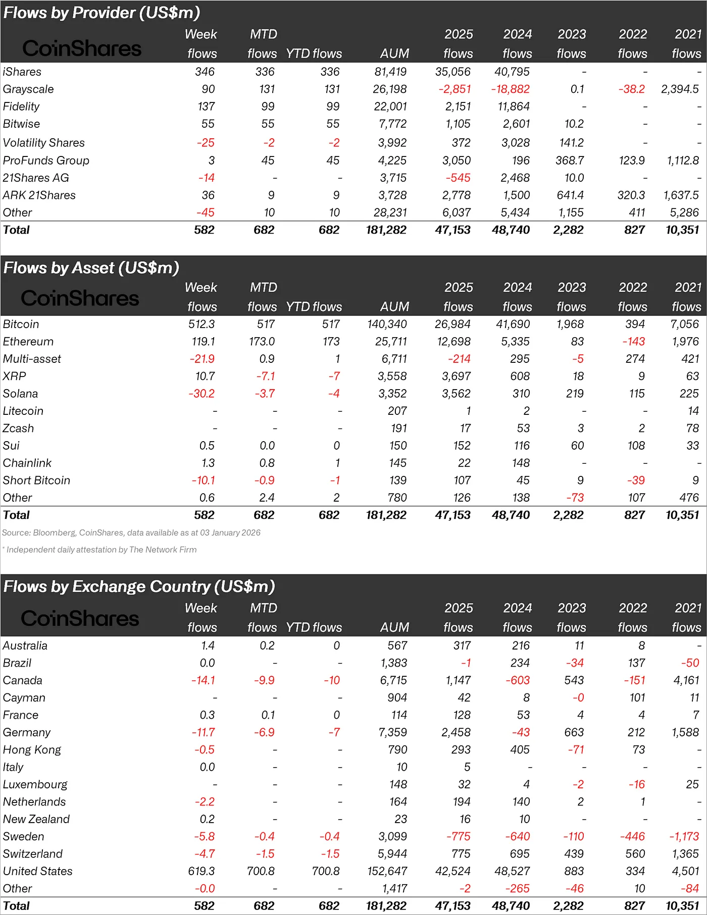 Инвестиционные продукты, связанные с цифровыми активами, завершили 2025 год с общими глобальными притоками на уровне $47,2 млрд — чуть ниже рекорда 2024 года ($48,7 млрд). Год также стартовал на позитивной ноте: в прошлую пятницу притоки составили $671 млн, а совокупный показатель за неделю достиг $582 млн после оттоков в начале недели.