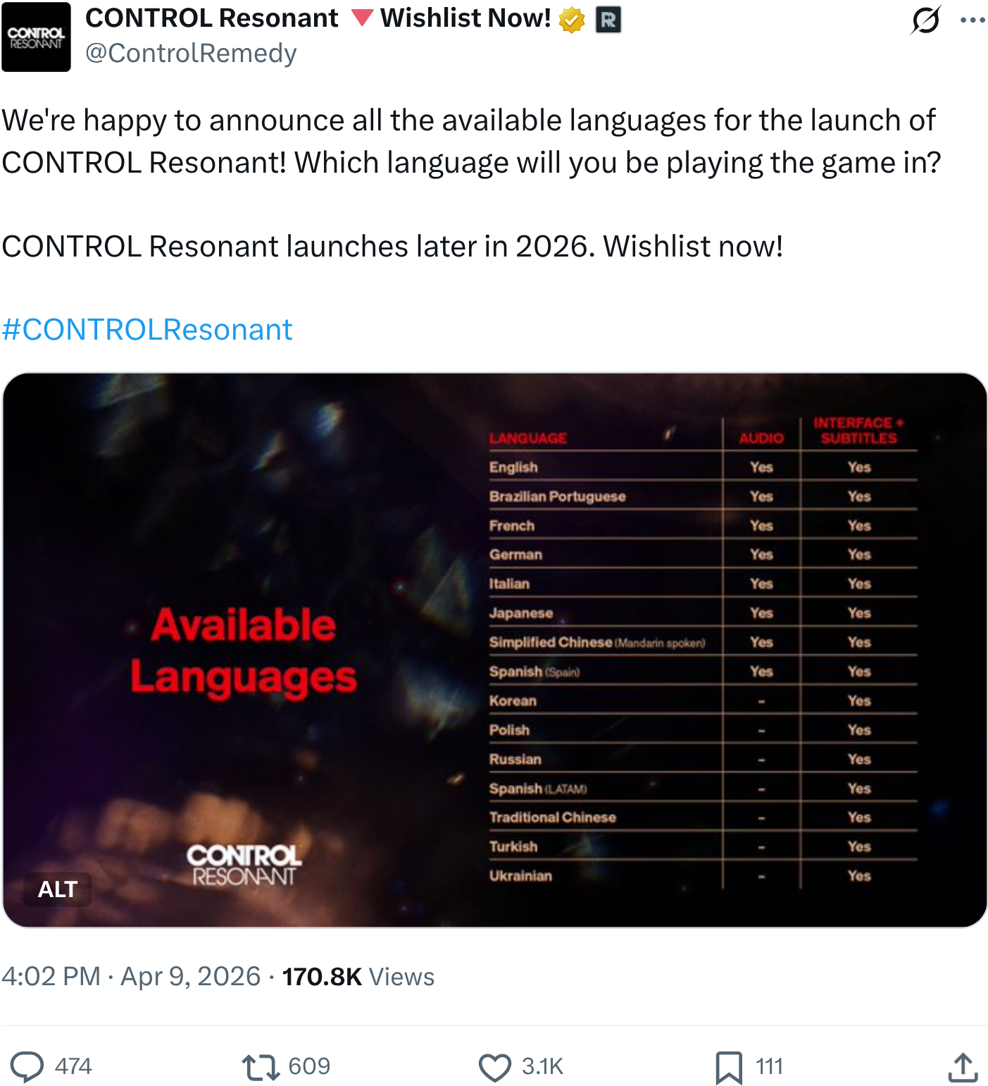 «Мы рады объявить все доступные языки для запуска CONTROL Resonant! На каком языке вы будете играть? CONTROL Resonant выходит позже в 2026 году. Добавьте в список желаний сейчас!», — говорится в официальной заметке Remedy в Х.