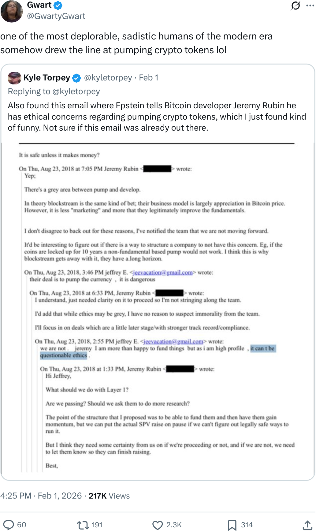 «Я более чем рад финансировать вещи, но поскольку я — публичная персона, это не может быть сомнительной этикой. Их схема — пампить валюту, это опасно», — написал Эпштейн Рубину, намекая, что его могло больше беспокоить потенциальное плохое освещение в медиа.