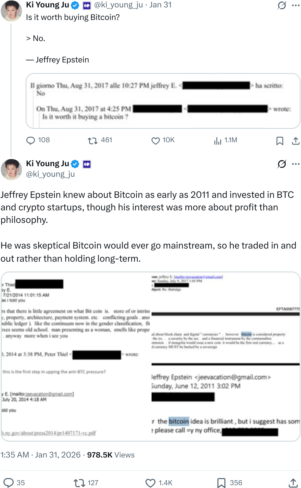 Основатель CryptoQuant Ки Янг Джу подтверждает, что Эпштейн знал о биткоине еще с 2011 года и инвестировал в криптовалюту и смежные стартапы. Впрочем, он не рассматривал BTC как актив для долгосрочного хранения, отдавая предпочтение торговле и краткосрочной прибыли. В переписке 2017 года на вопрос, вкладываться ли в биткоин, он лаконично написал — «нет».